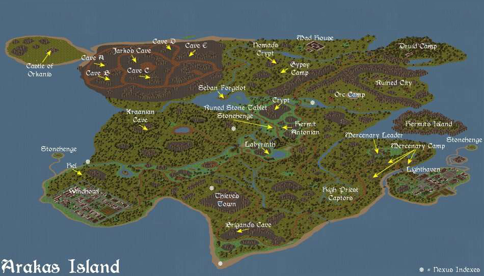 Lance Silversmith Castle of Orkanis Gypsy Camp Nomad's Crypt Crypt Labyrinth Kraanian Cave Brigand's Cave Lighthaven Old Hermit's Island Druid Camp Ruined City Mad House Thieve's Town Cursed Valleys Windhowl